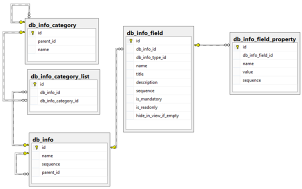 Db_info_id : Foreign key (FK) to the chapter (Db_info) to which this field belongsDb_input_type_id : FK to the type of field (e.g. Textbox, TextArea)Name : name/code of the fieldTitle : value that will be shown on the User interfaceDescription : Internal description to help the userSequence : numeric value to order the fields within the chapterIs_readonly : the user is not able to modify the fieldHide_in_view_if_empty : will hide the field if it is not filled after saving (used only for the reports)Db_info_field_property :