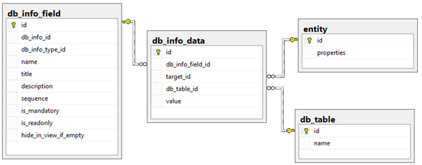 db_info_field_id : FK to the db_info_fieldtarget_id : the id of the object (like company.id)db_table_id : FK to the db_table to specify to which table the target_id refers. This field is mandatory because a chapter of info fields can be shared on multiple entities in specific cases.value : the value of the field (CF chapter “How values are stored”)Entity (not actual table) :